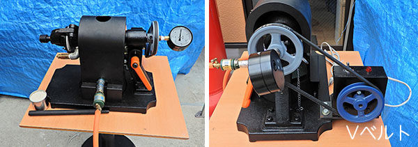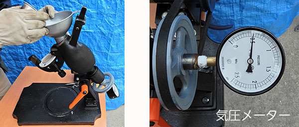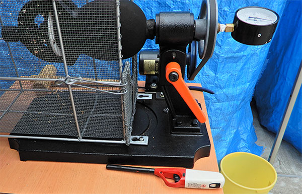 4. 付属のカップ1杯分のお米、や もち米などを漏斗などを使って入れます。 入れ終わったら、蓋をしっかり閉じセットします。 Vベルトをはめ込みます。コンロと風よけを設置し火をつけ、回転スイッチを入れます。