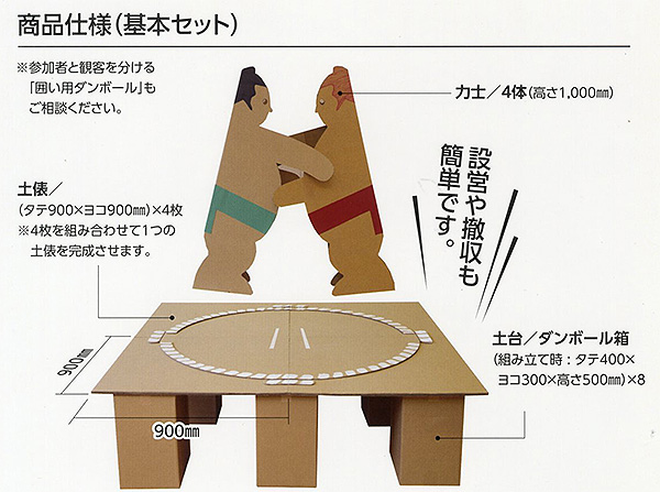 迫力満点、紙相撲(段ボール製)、紙相撲って言ったら机の上でと思うかもしれませんが、何と力士の大きさは高さ1メートル、土俵は180×180cmと大人も子供も楽しめるサイズ感、段ボールなので、思いのまま色を塗ったりもできます。小さいサイズもあります。土俵の組立は大人2人で10分程度!!ちょっとしたイベントなどでいかがでしょうか・・・